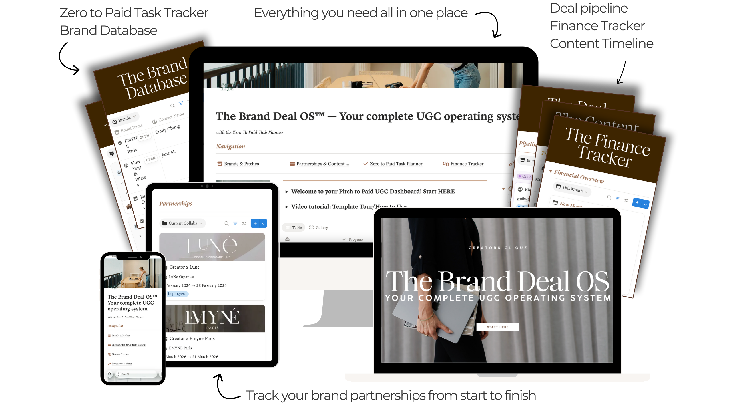 ✔ Brand & pitch tracker — Every brand you've contacted, every conversation logged, every follow up scheduled. Never send a pitch and forget about it again. Never lose a deal because life got in the way.